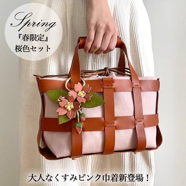 桜染めレザーで仕立てた桜チャーム付き!本革かご&巾着バッグ(30日以内に発送)