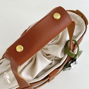 キャンバス生地でしっかり仕立てた巾着をすっぽり入れており、たくさんものを入れて巾着を絞っても可愛いシルエットになるようにデザインしています。
