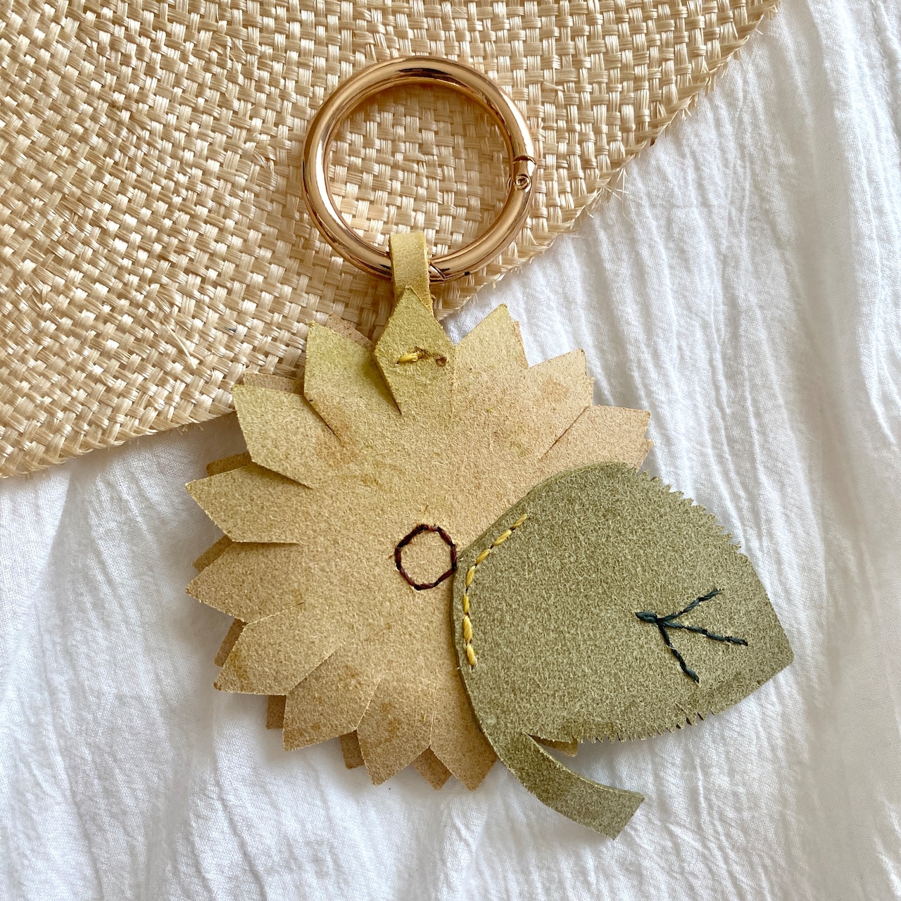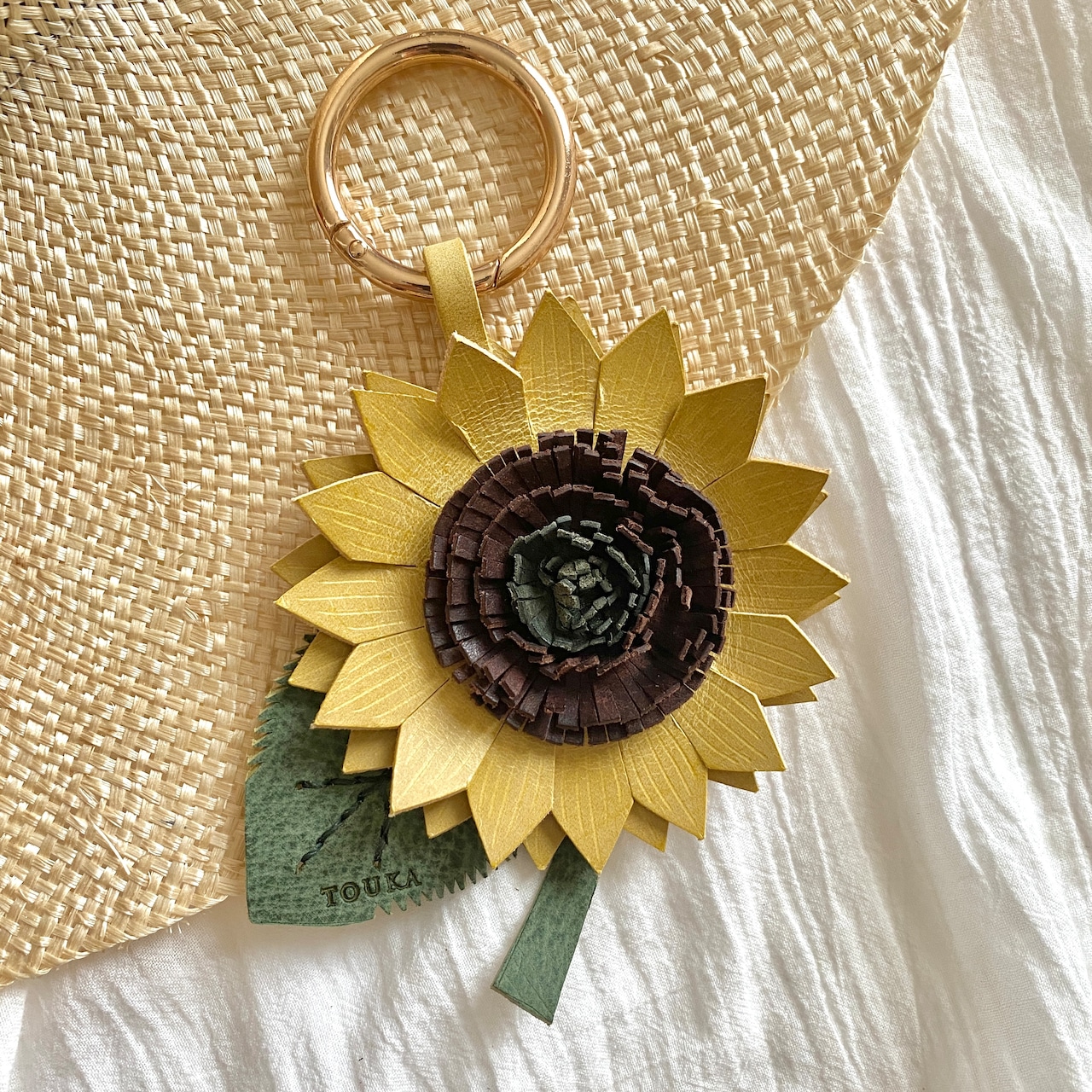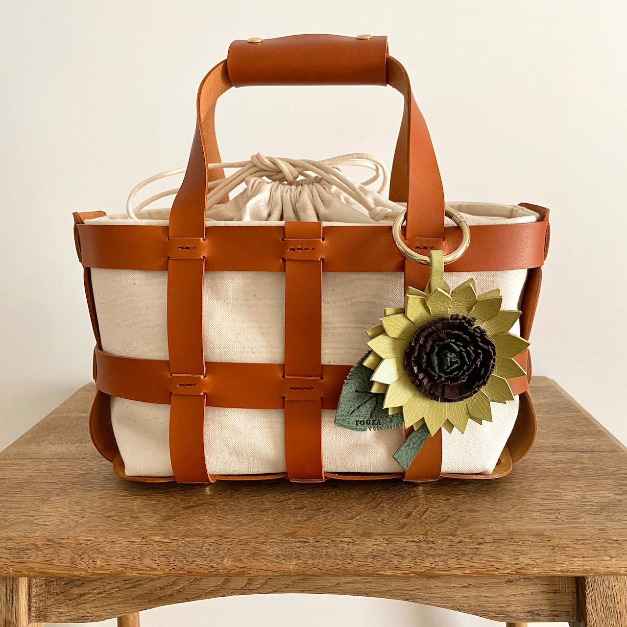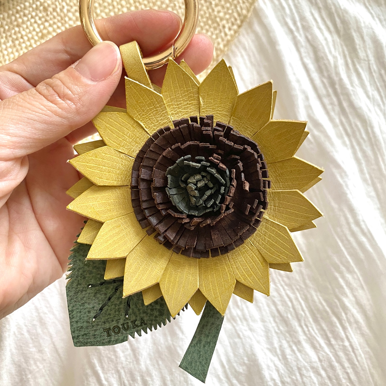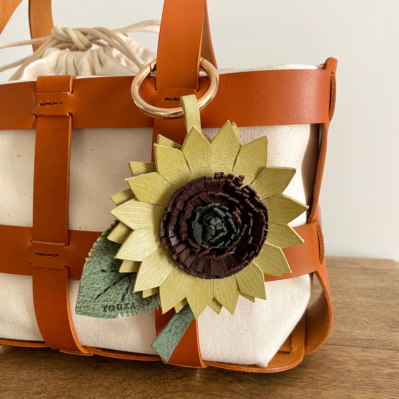 太陽に向かって咲く姿が美しく、見る人の心を惹きつける向日葵を本革でバッグチャームに仕立てました。
