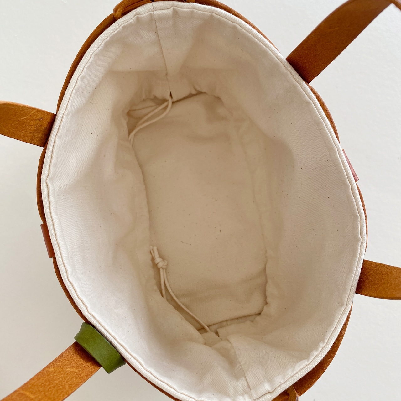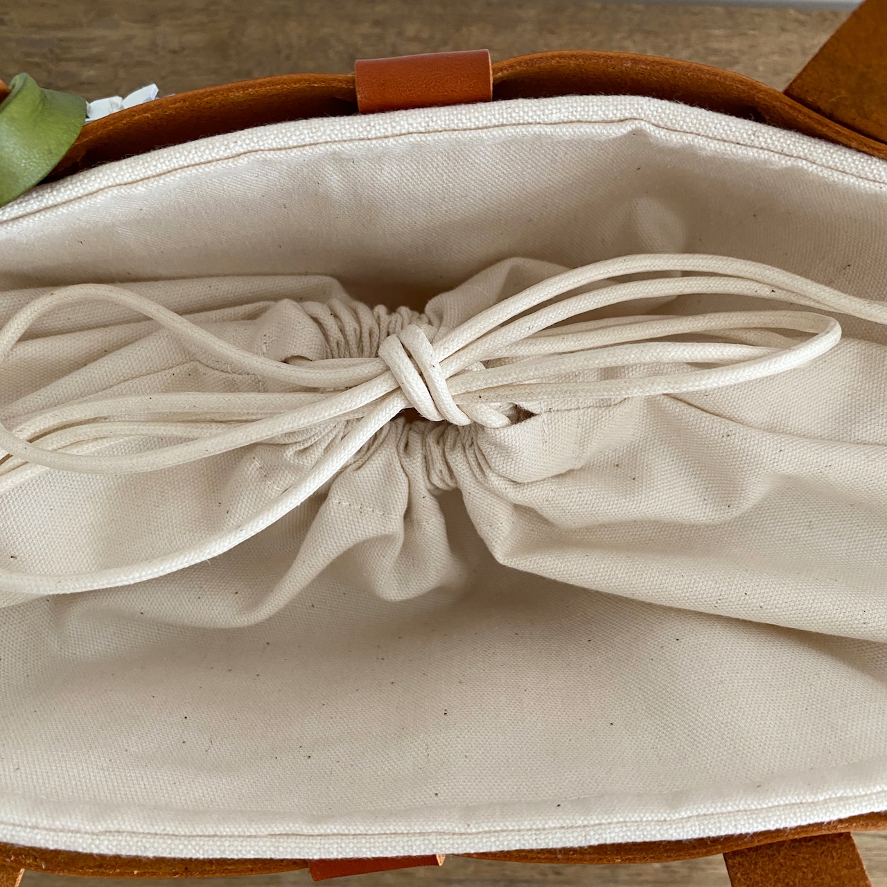 キャンバス生地でしっかり仕立てた巾着をすっぽり入れており、たくさんものを入れて巾着を絞っても可愛いシルエットになるようにデザインしています。