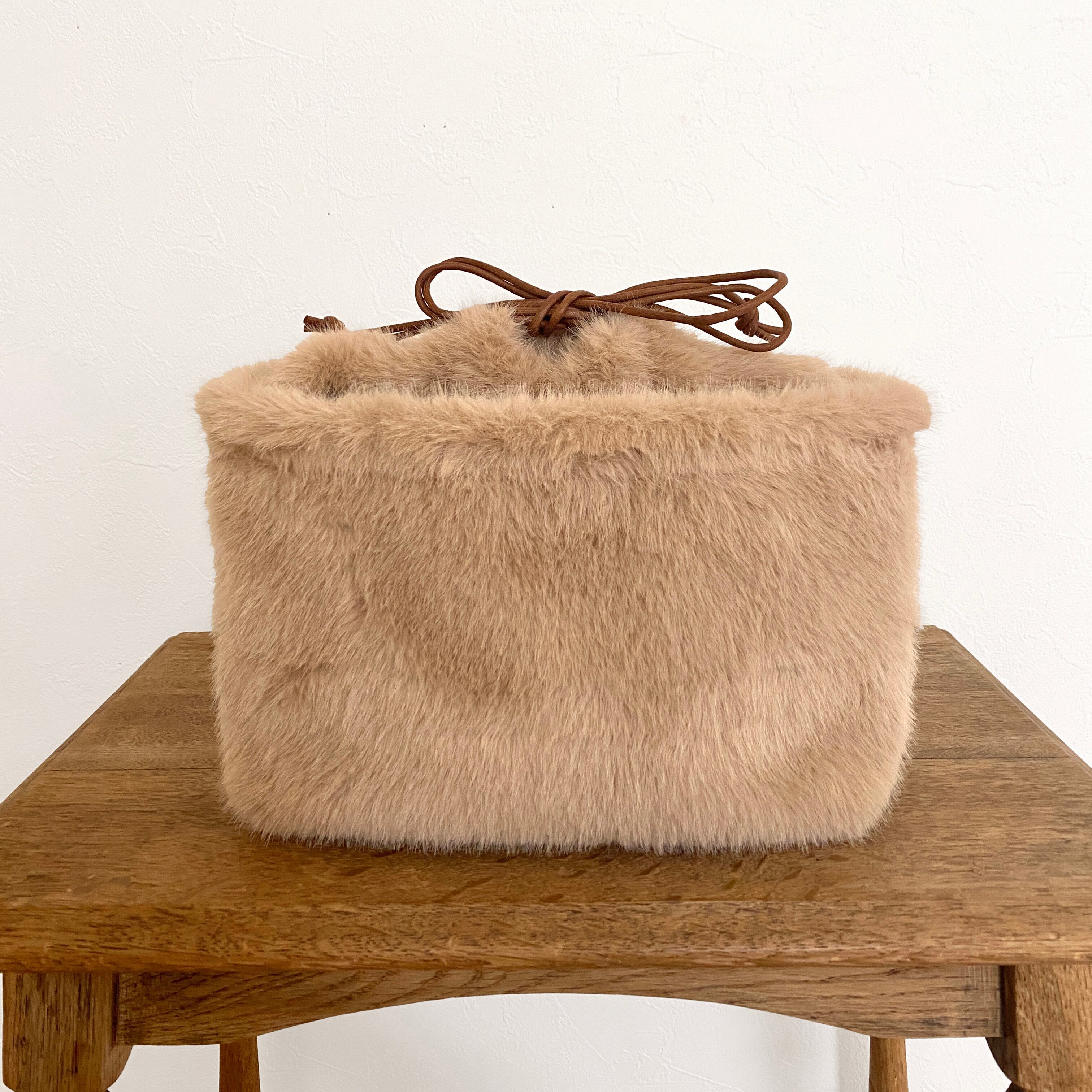 ほかほかのファー生地でしっかり仕立てた巾着をすっぽり入れており、たくさんものを入れて絞っても可愛いシルエットになるようにデザインしています。