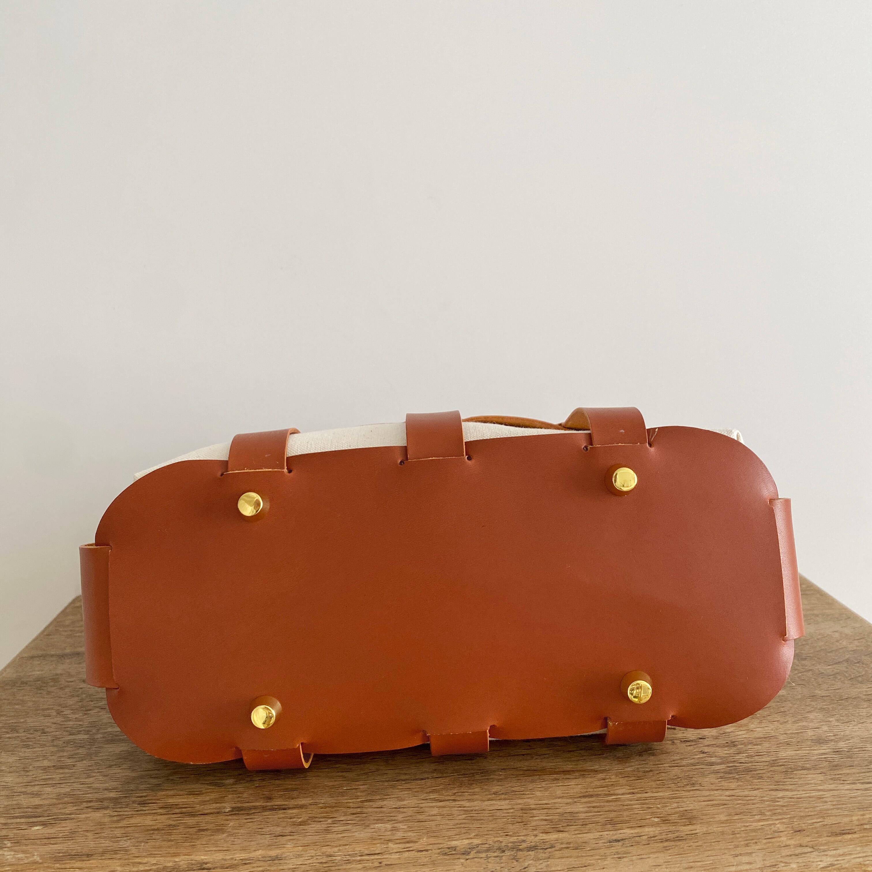 コロンとしたシルエットが印象的な革かごバッグ。
