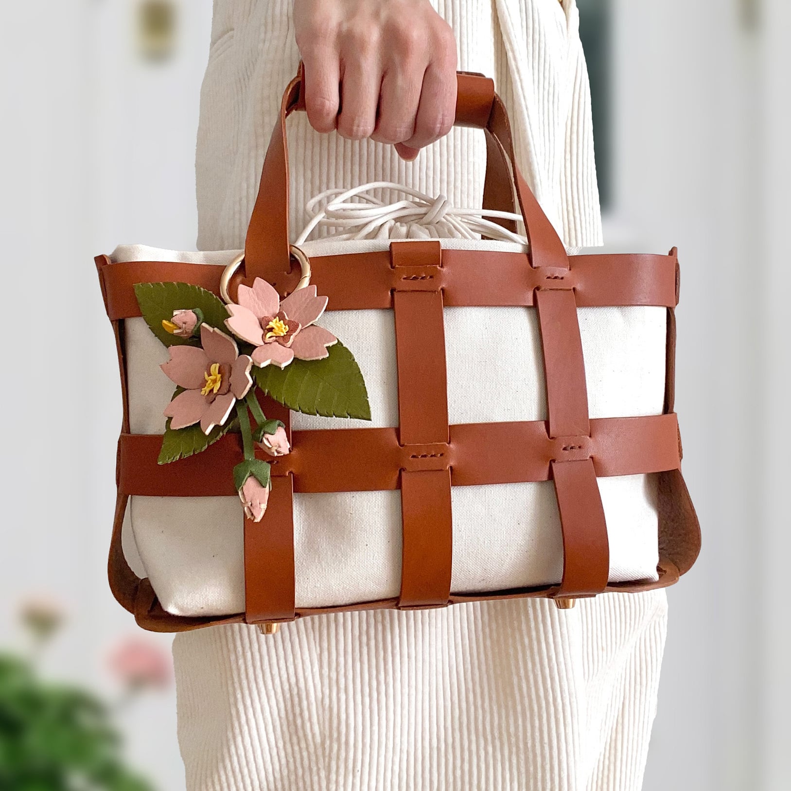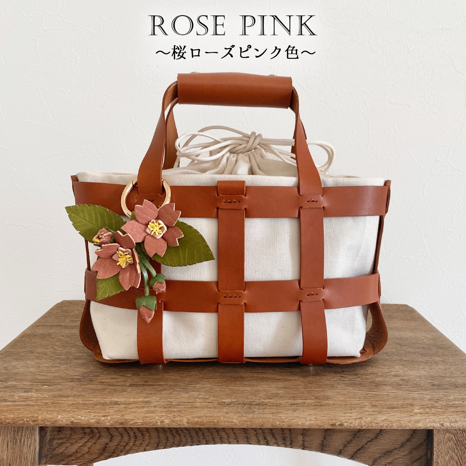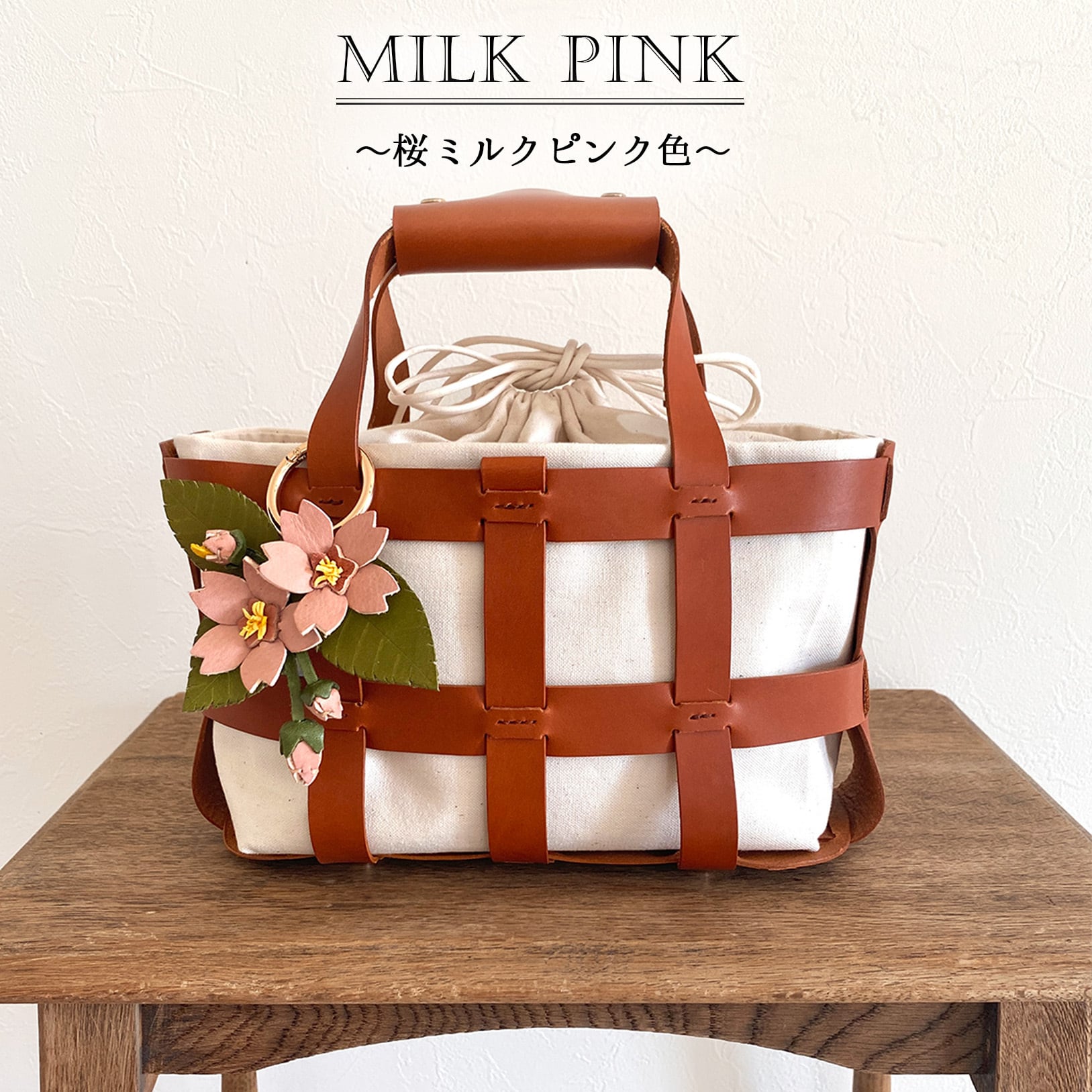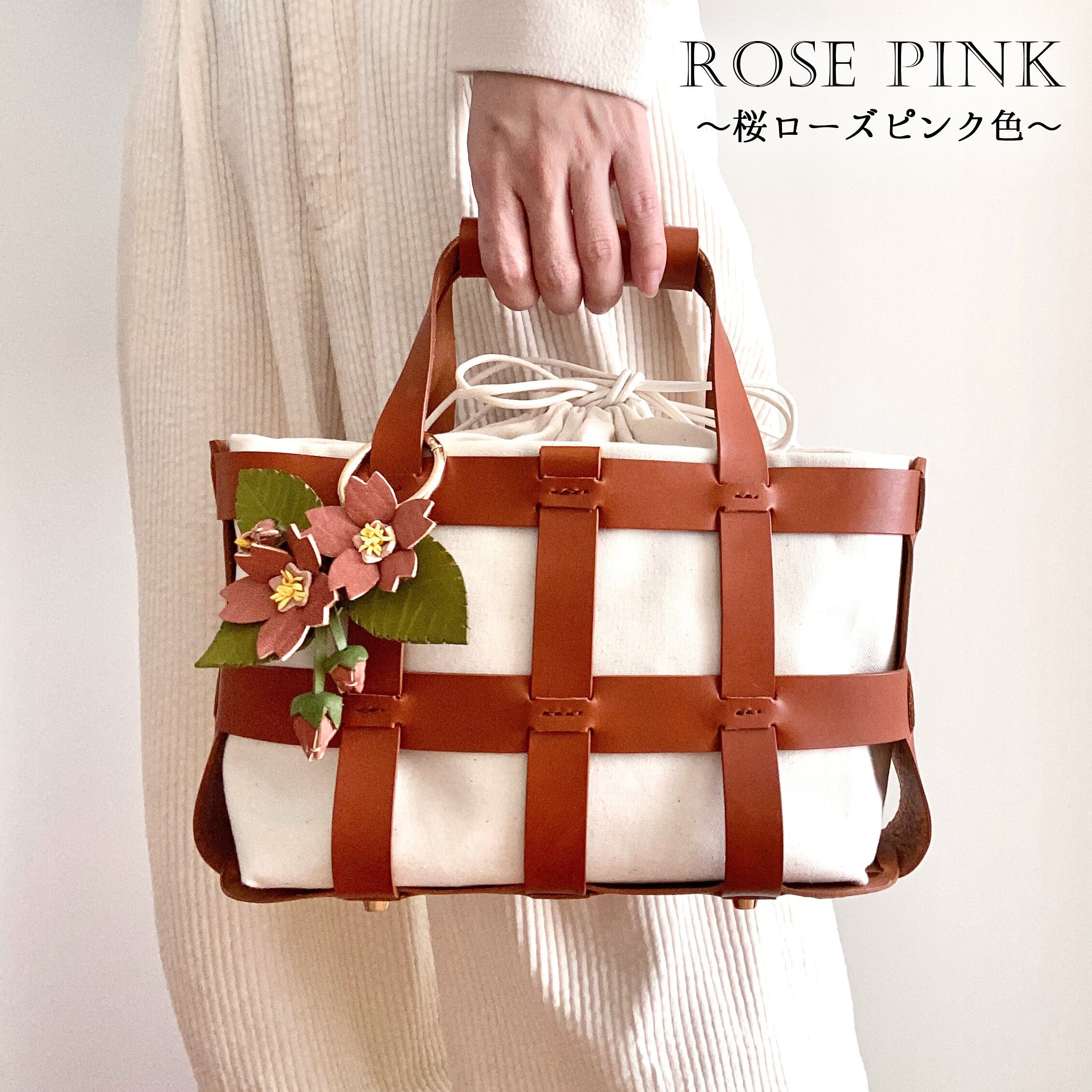桜染めレザーで仕立てた桜チャーム付き!本革かご&巾着バッグ(30日以内に発送)