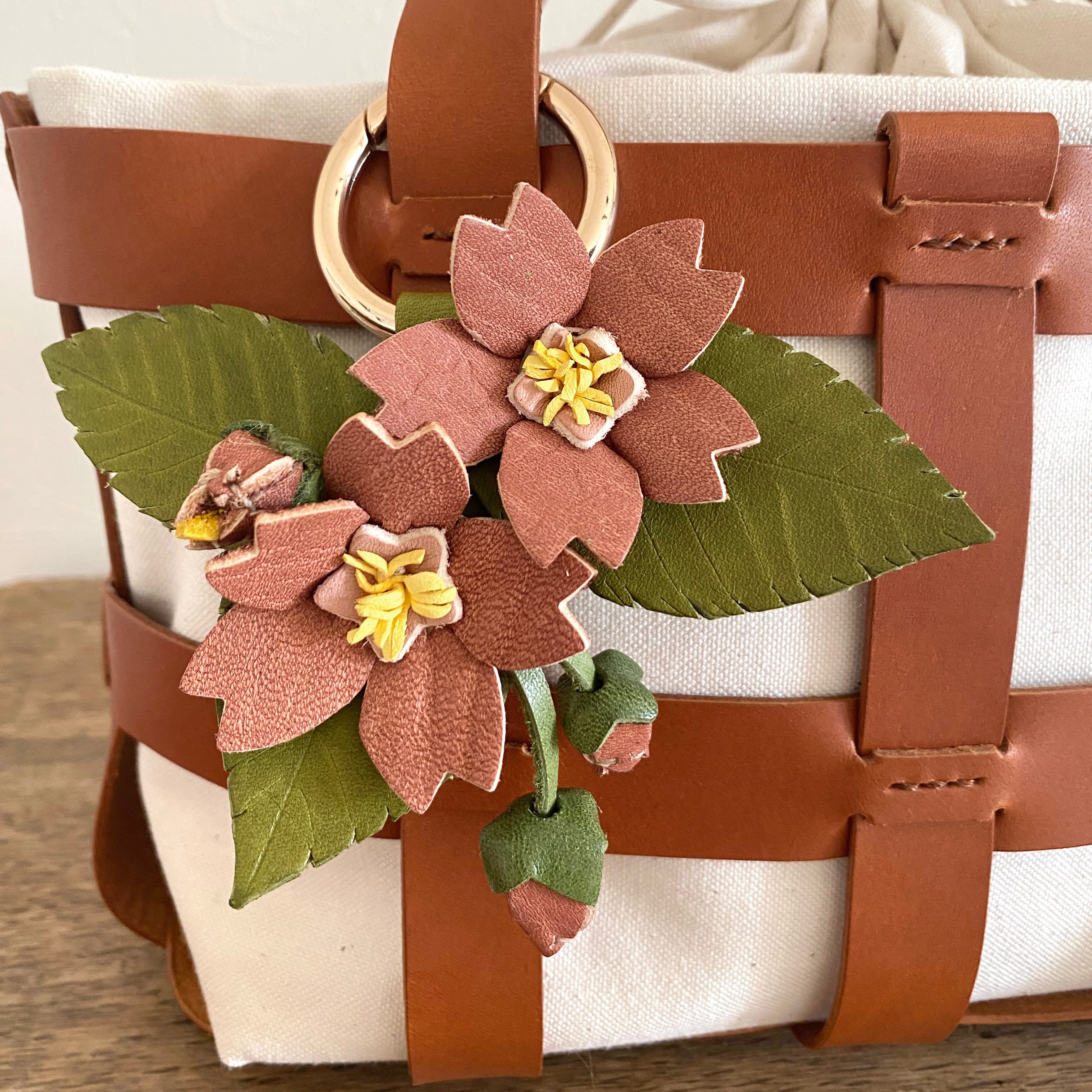 本物の桜から生まれた「桜染めレザー」のチャーム。