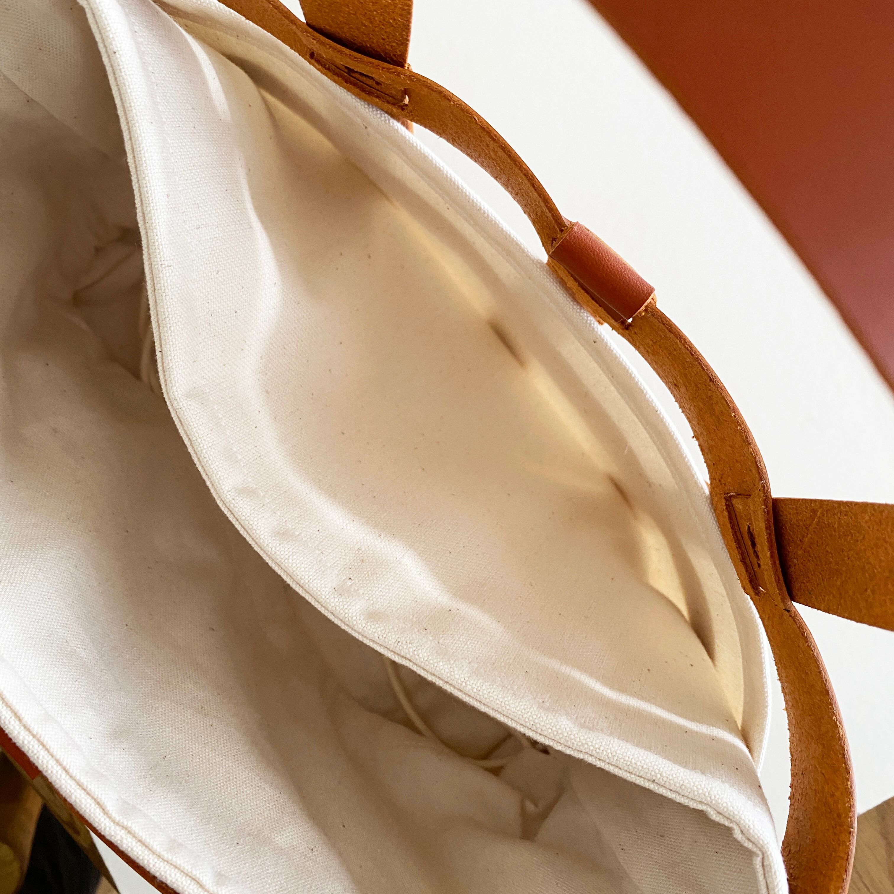 内側にはしっかり仕立てたキャンバス巾着付き。