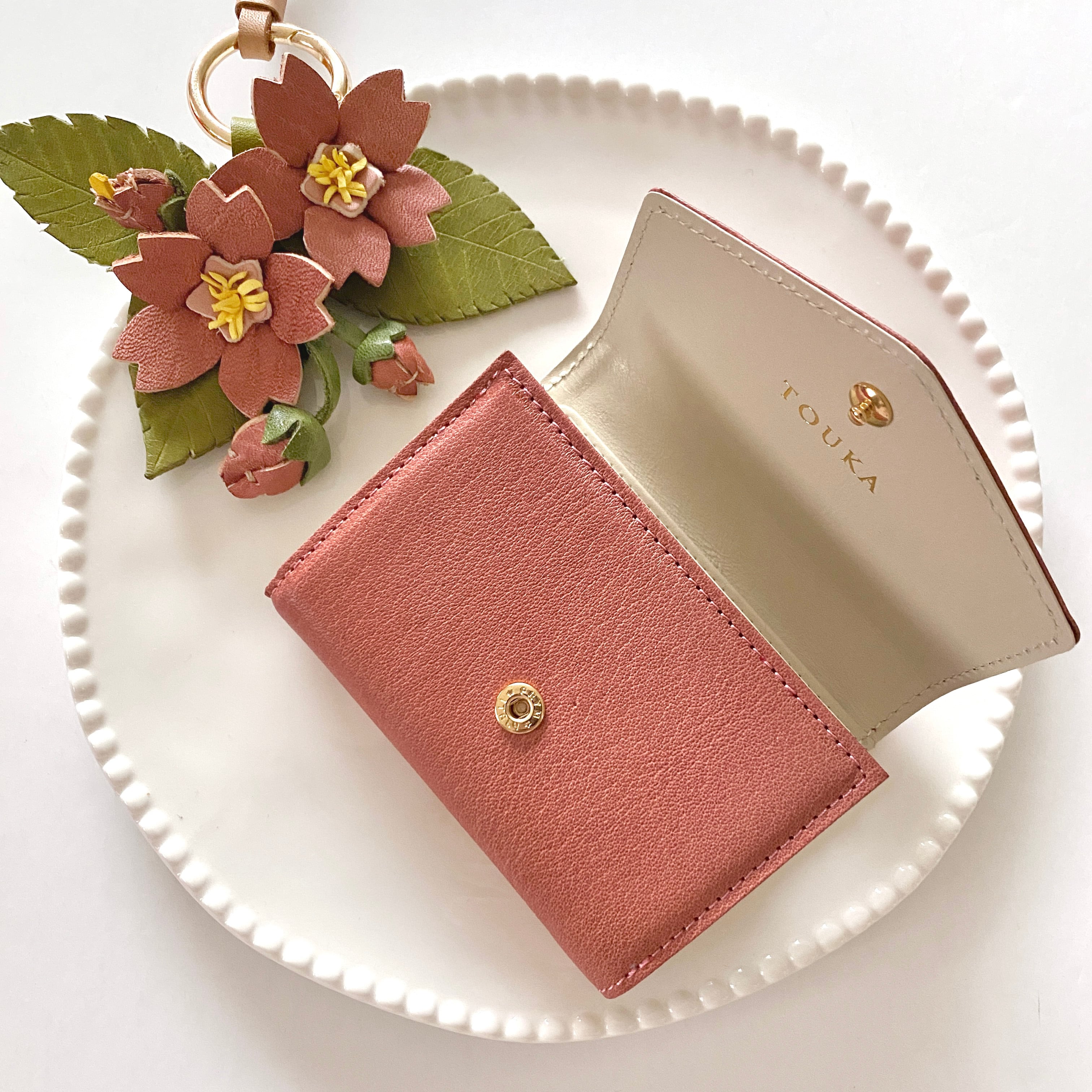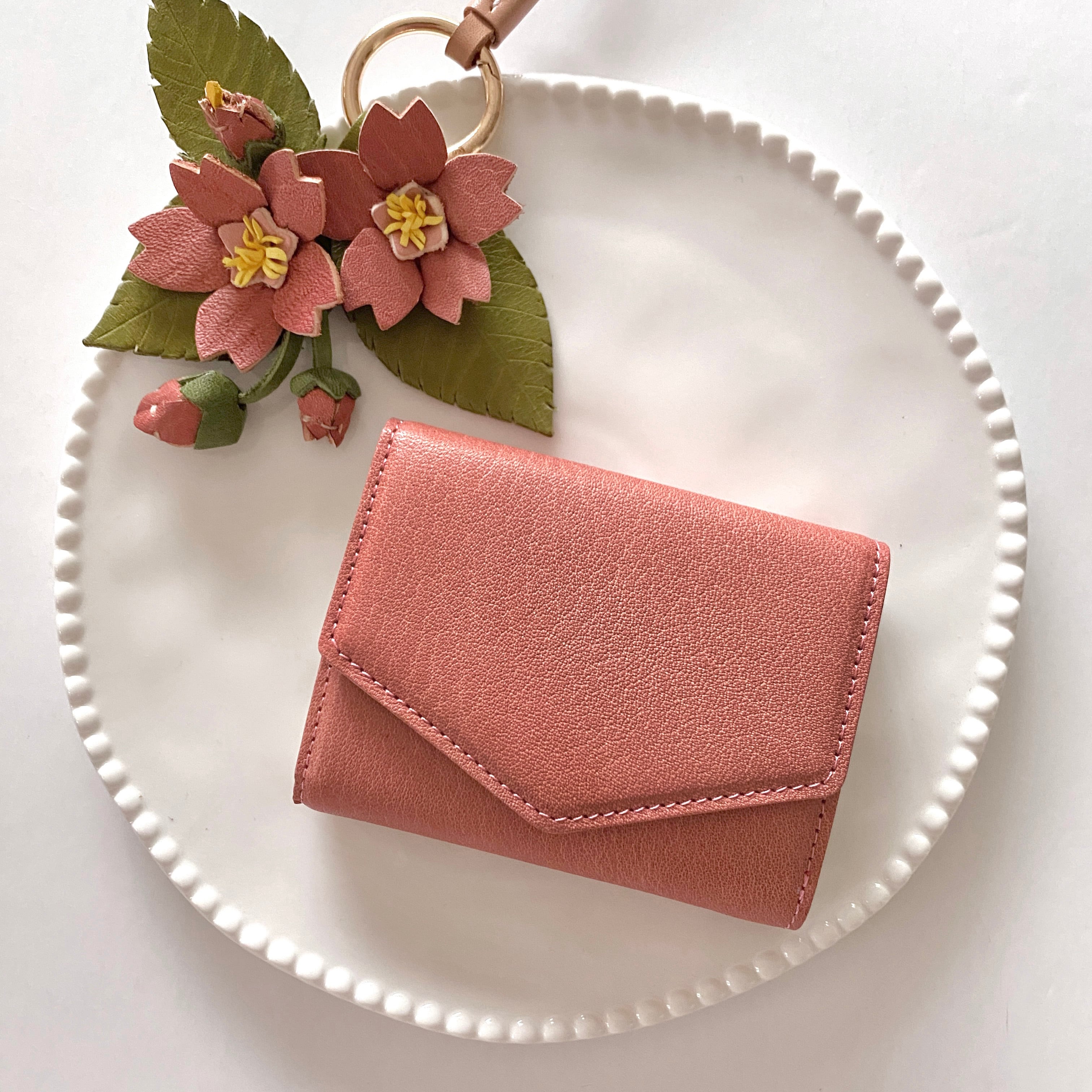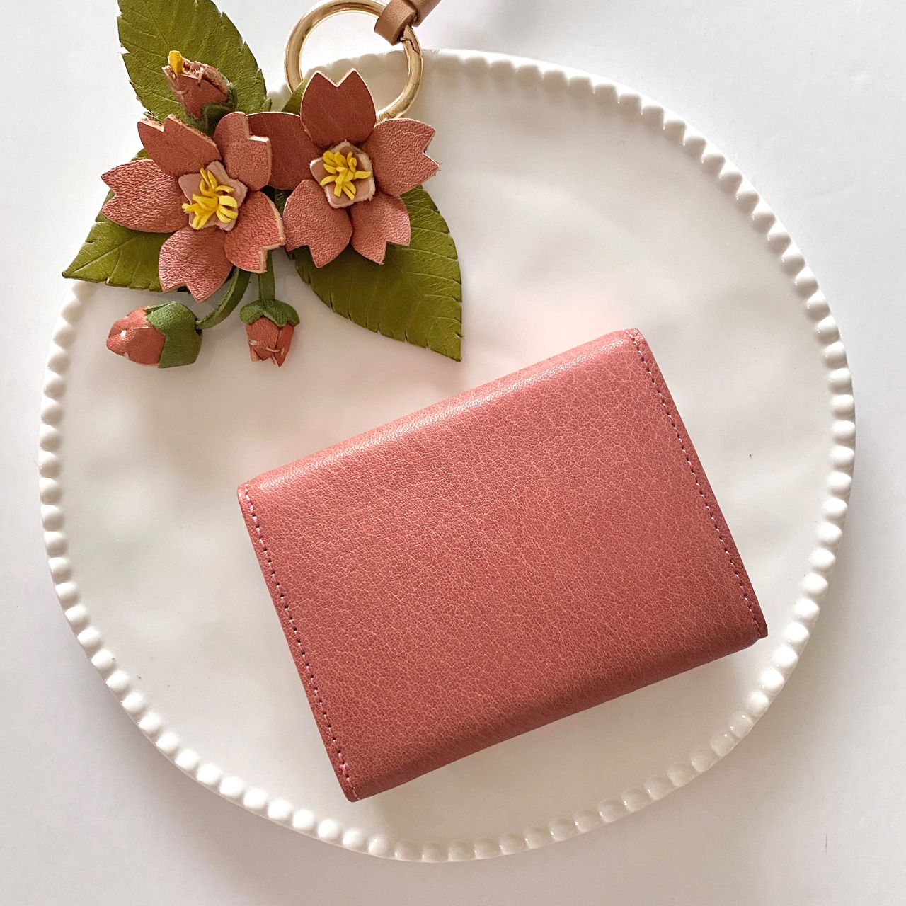 ミニ財布 レザー 本革 誕生日 花 さくら ピンク レザー ウォレット 春財布 桜 押し花 コインケース コンパクト 本革財布 牛革 誕生日 ギフト 彼女 お母さん 三つ折り財布 軽量