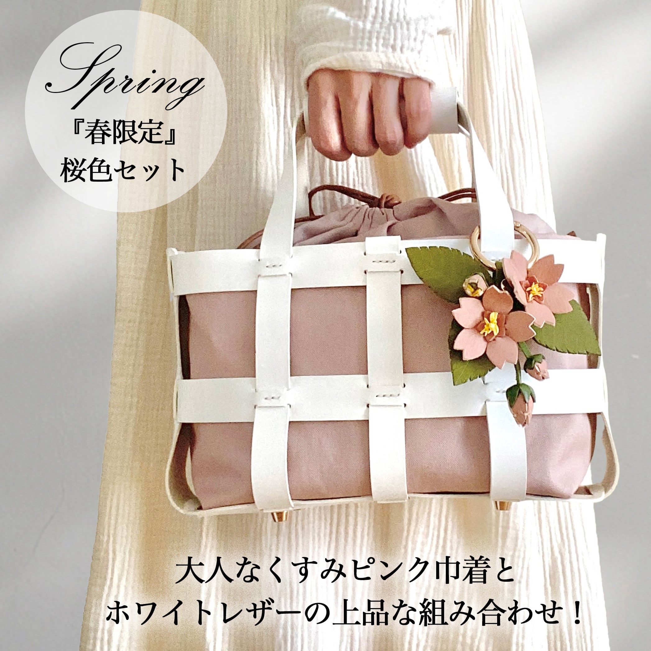 期間限定ホワイトカラー!桜染めレザーで仕立てた桜チャーム付き!本革かご&巾着バッグ(3日以内に発送)